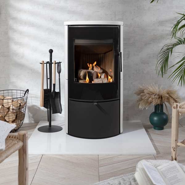 This contemporary wood burning stove combines modern design with efficient, eco-friendly performance. Finished in elegant white ceramic, it features clean lines, a large viewing window, and practical built-in storage—making it a perfect addition to stylish, modern homes.