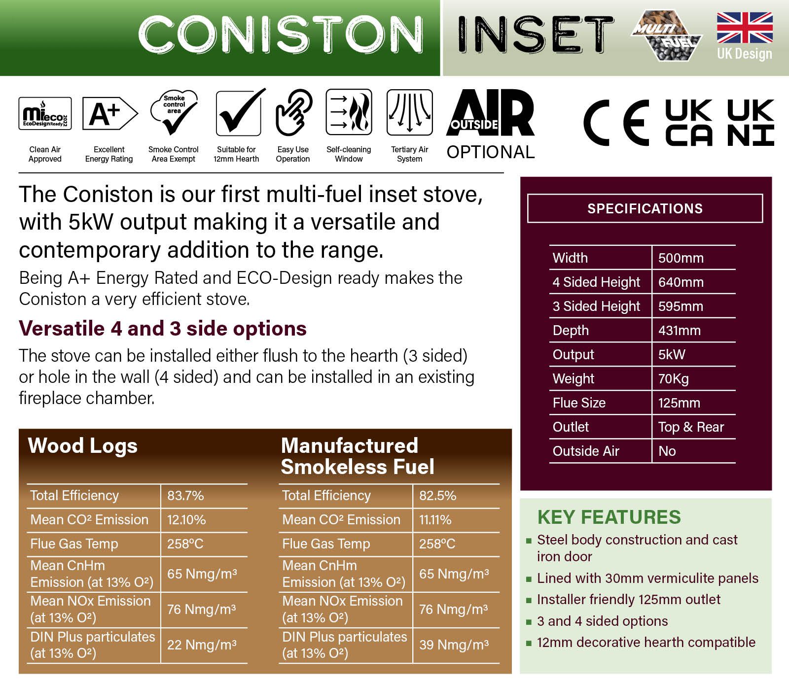 The Coniston is multi fuel 5kW inset stove – ECODesign 2022 and is Smoke Control Area Exempt. It is 83.7% efficient and has A+ Energy Rating. It only produces 12.10 mg of dust.