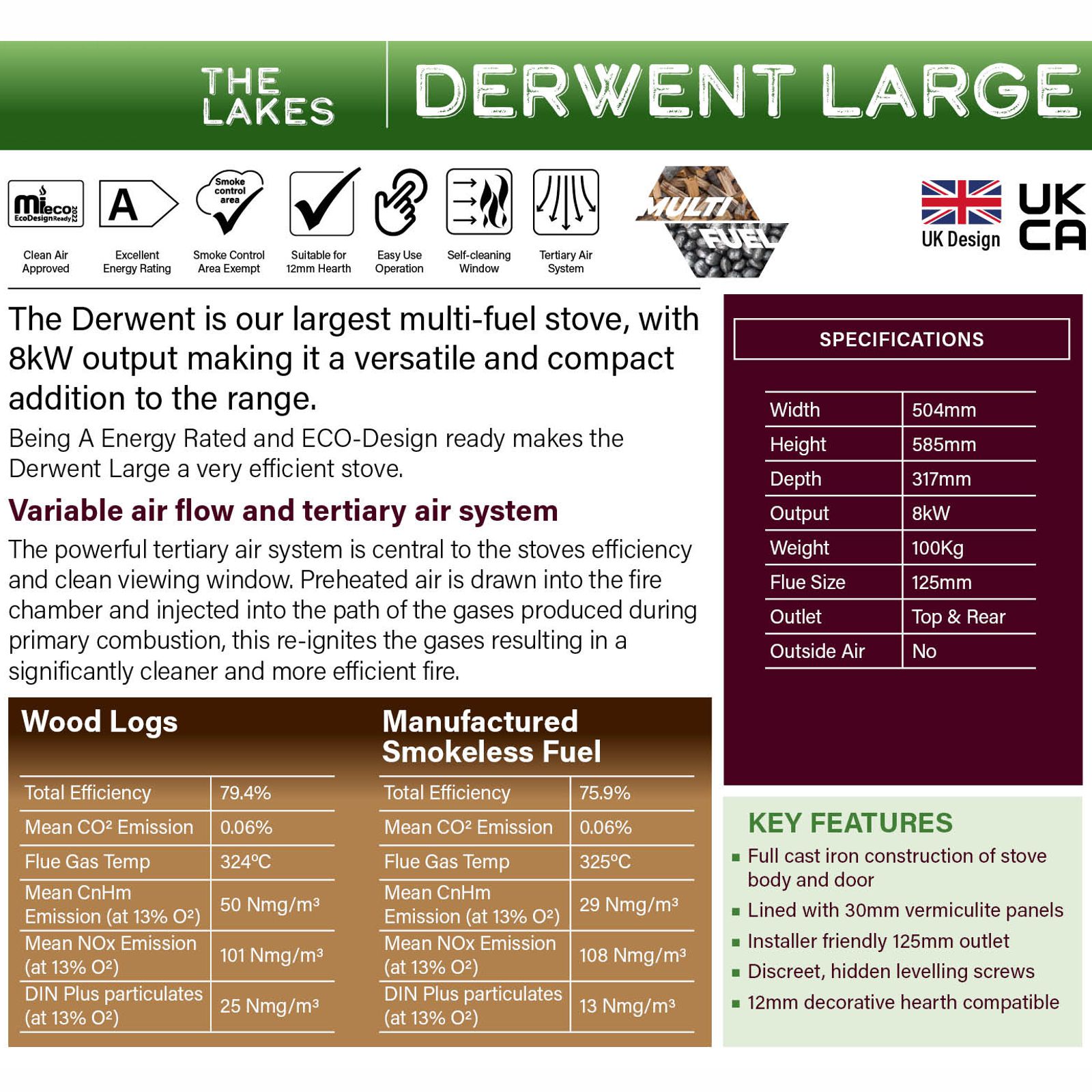 The Derwent is multifuel 8 kW stove – ECODesign 2022 and is Smoke Control Area Exempt. It is 79.4% efficient and has A Energy Rating.