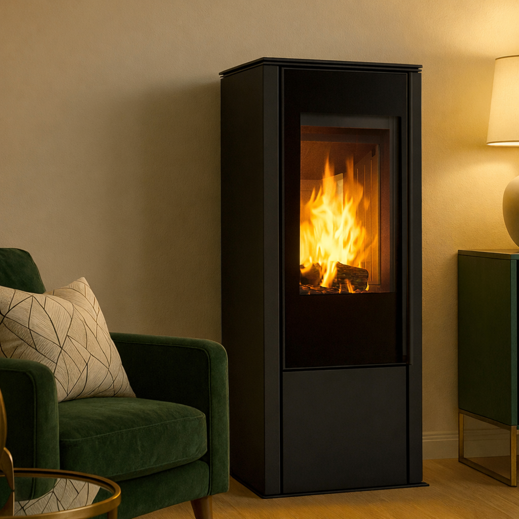The KRATKI HATI is a modern freestanding wood burning stove that combines a timeless rectangular design with advanced heating performance. Its clean lines and elegant black GLASS front panel create a sophisticated look that fits seamlessly into both contemporary and traditional interiors. Compact yet powerful, the HATI stove is an excellent choice for smaller spaces, offering efficient, eco-friendly heating without compromising on style.