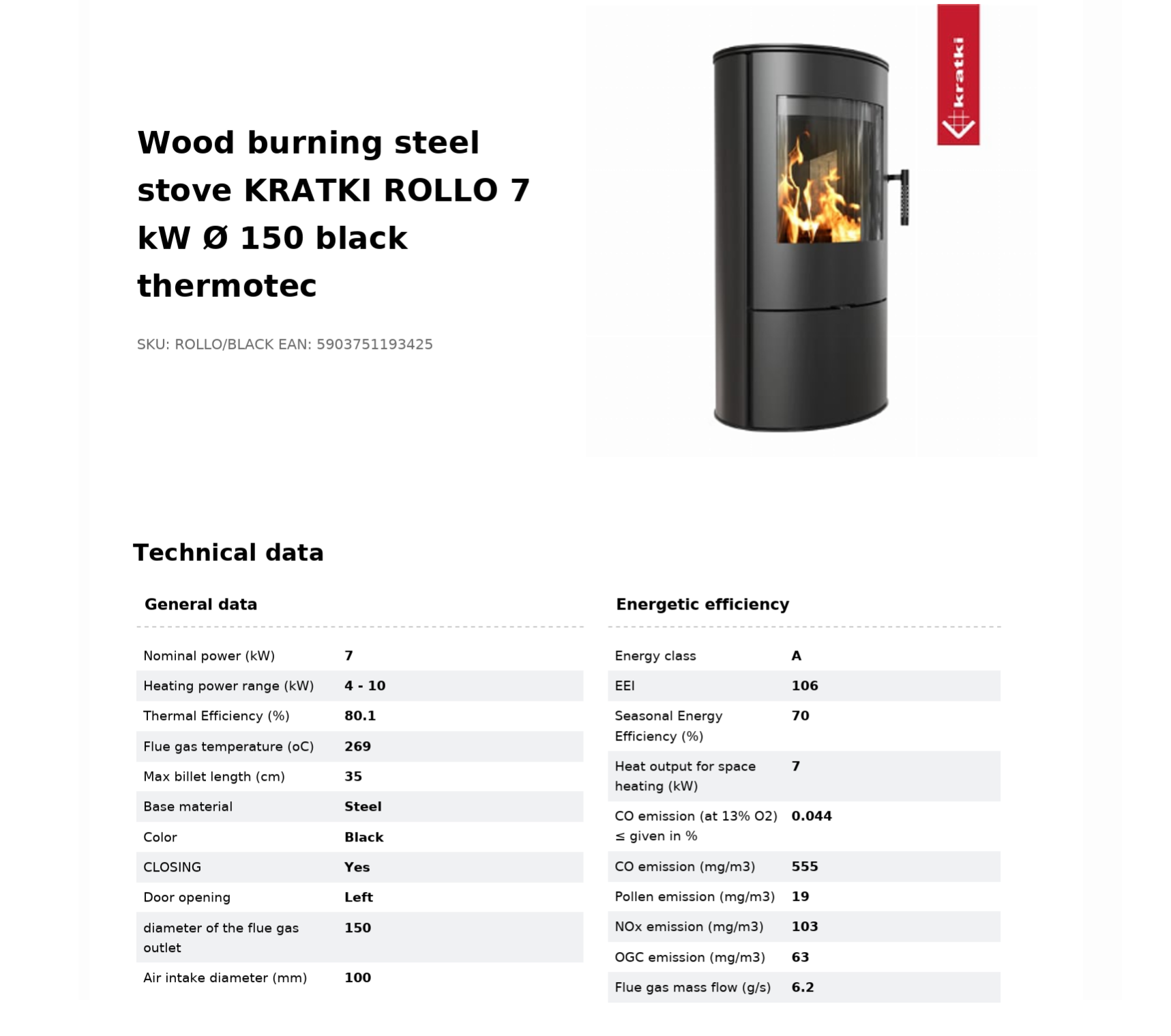 KRATKI ROLLO Steel Wood Burning Stove 7 kW black thermotec