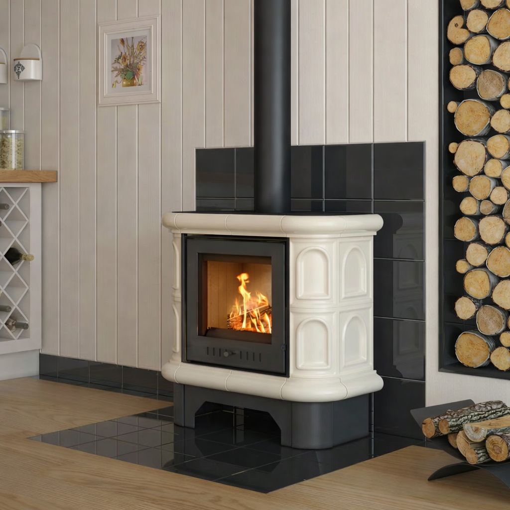 The KRATKI WK440 is a beautifully crafted tiled wood burning stove that combines retro elegance with modern heating efficiency. Finished with glossy cream ceramic tiles, it not only serves as a reliable heat source but also as a decorative feature in any interior. Thanks to its heat-accumulating construction and advanced combustion technology, the WK440 provides long-lasting warmth even after the fire has gone out, making it both practical and energy-efficient.