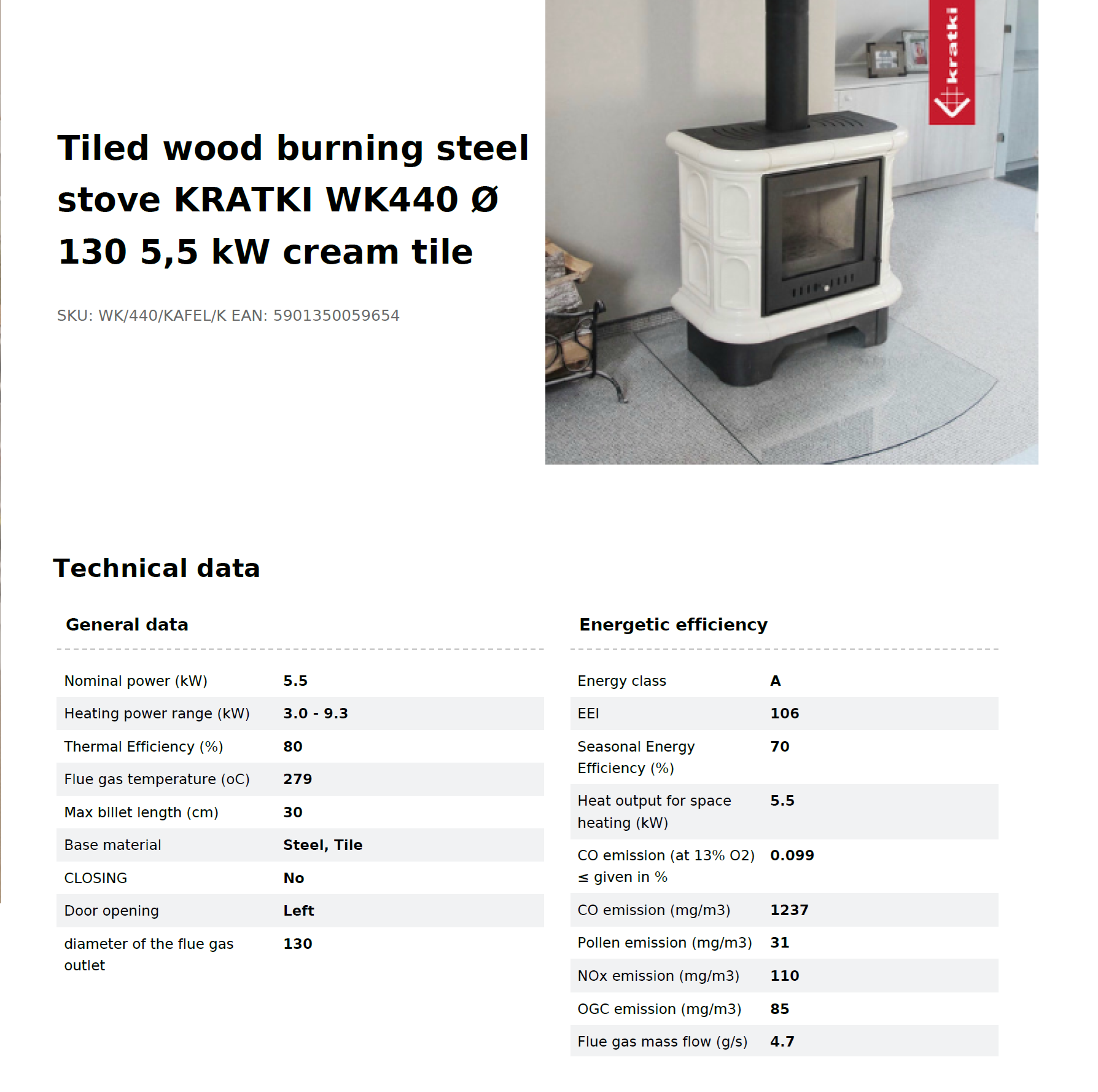 KRATKI WK440 Tiled Wood Burning Stove 5.5 kW Ø130