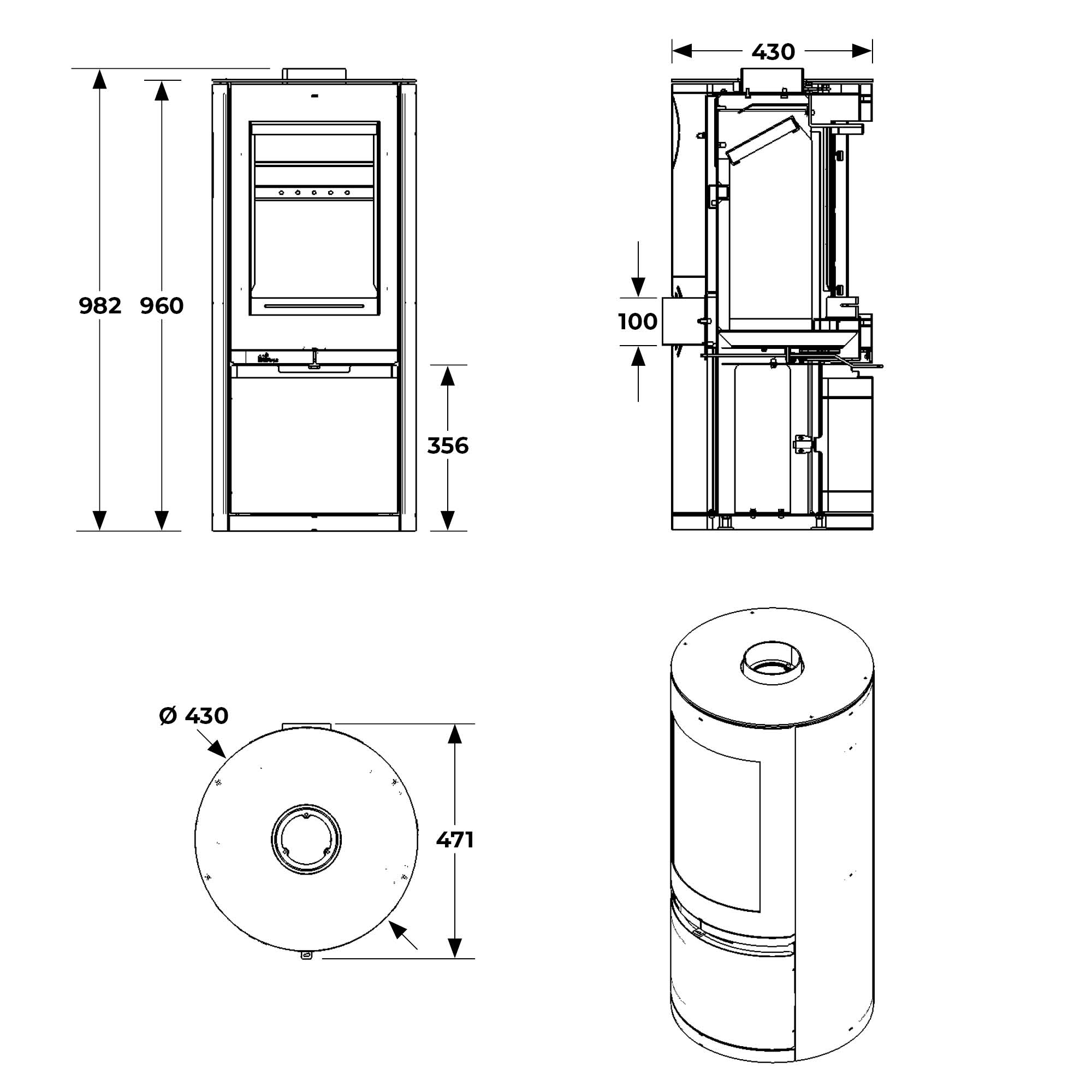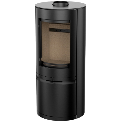 A cylindrical ultra modern wood burning stove, where every detail is well thought out. With an elevated combustion chamber and ergonomically integrated steel handles.