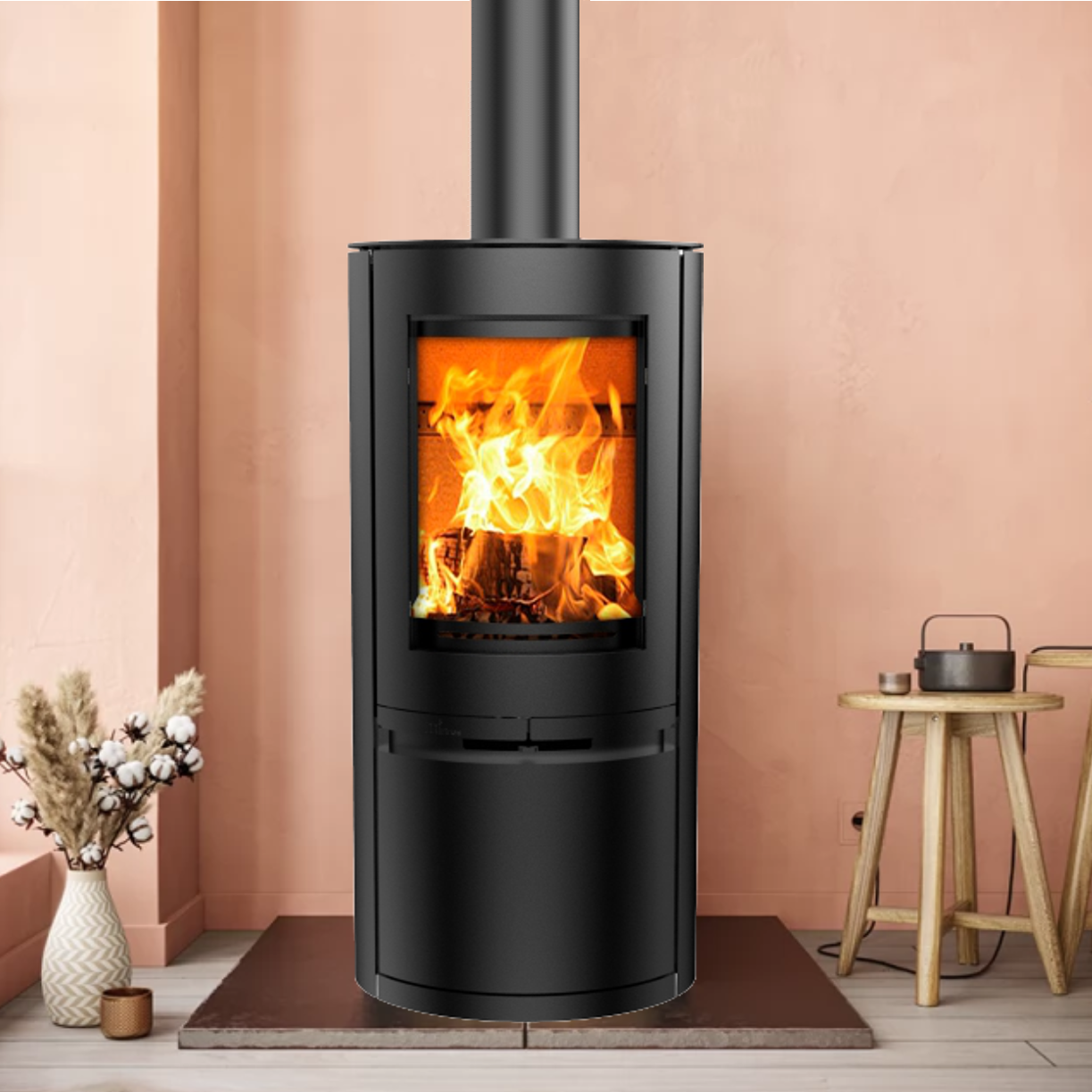 The Poppy has a slender, round, sculptural, clean design. The pure lines and discreet handle of the beautifully curved door match the stoves contemporary nordic inspired design. The large curved glass pane gives you an amazing view of the fire, where the flames really do become the focus.