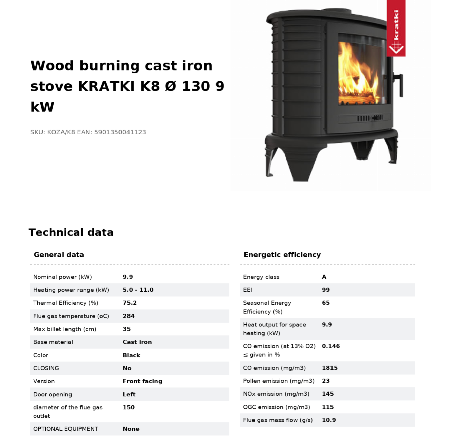 Wood burning KRATKI K8 9 kW cast iron stove Ø130